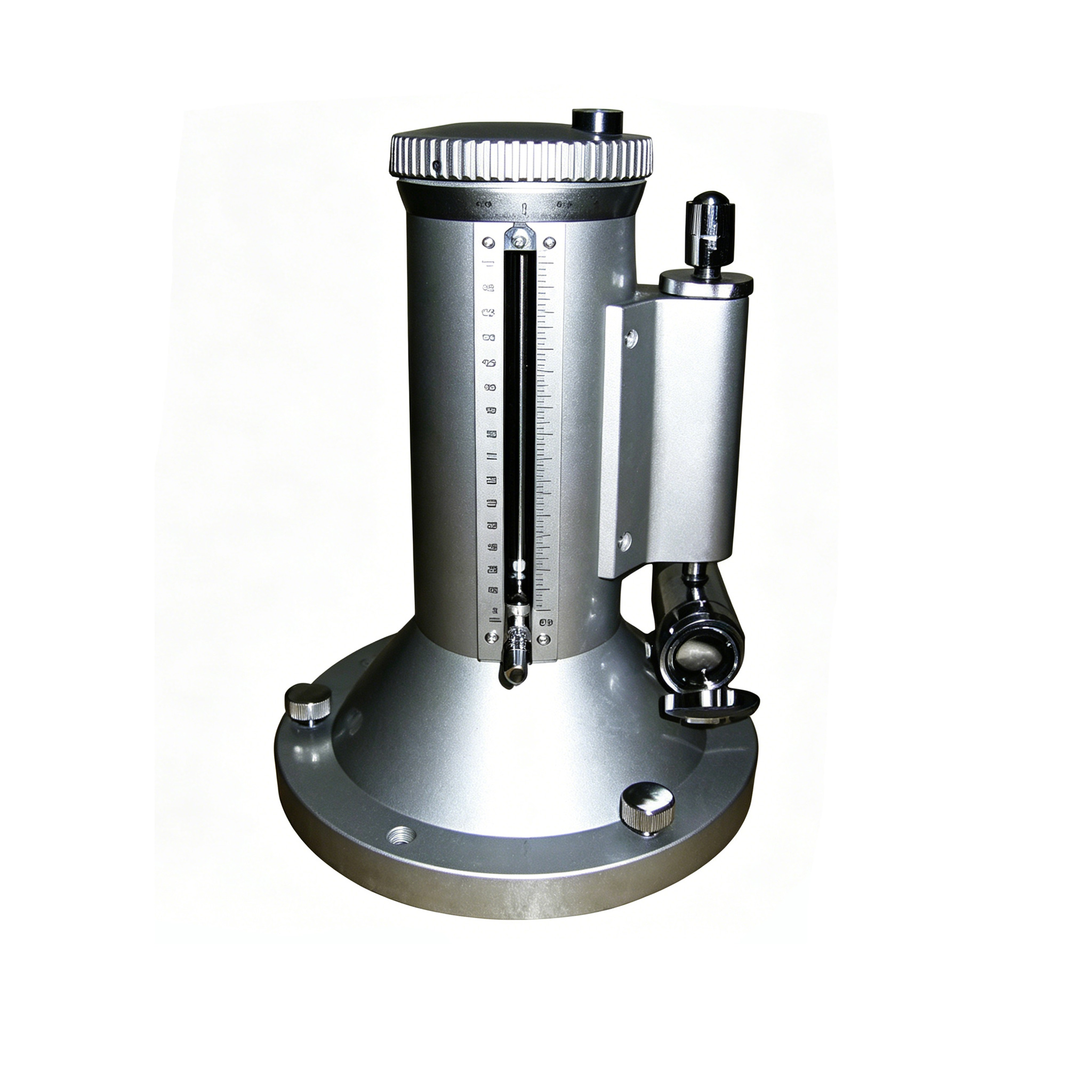 微調(diào)部分:由刻有200等分的微調(diào)盤(pán)固定在長(zhǎng)螺桿上,長(zhǎng)螺桿帶動(dòng)蓄水筒作上升或下降運(yùn)動(dòng),在水匣靜壓接嘴上裝有示度滑塊,示度滑塊沿示值標(biāo)尺上下移動(dòng)指出蓄水筒的位移高度。