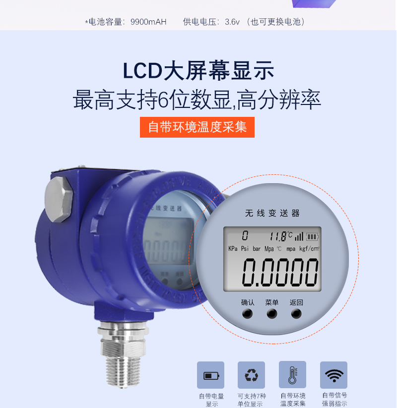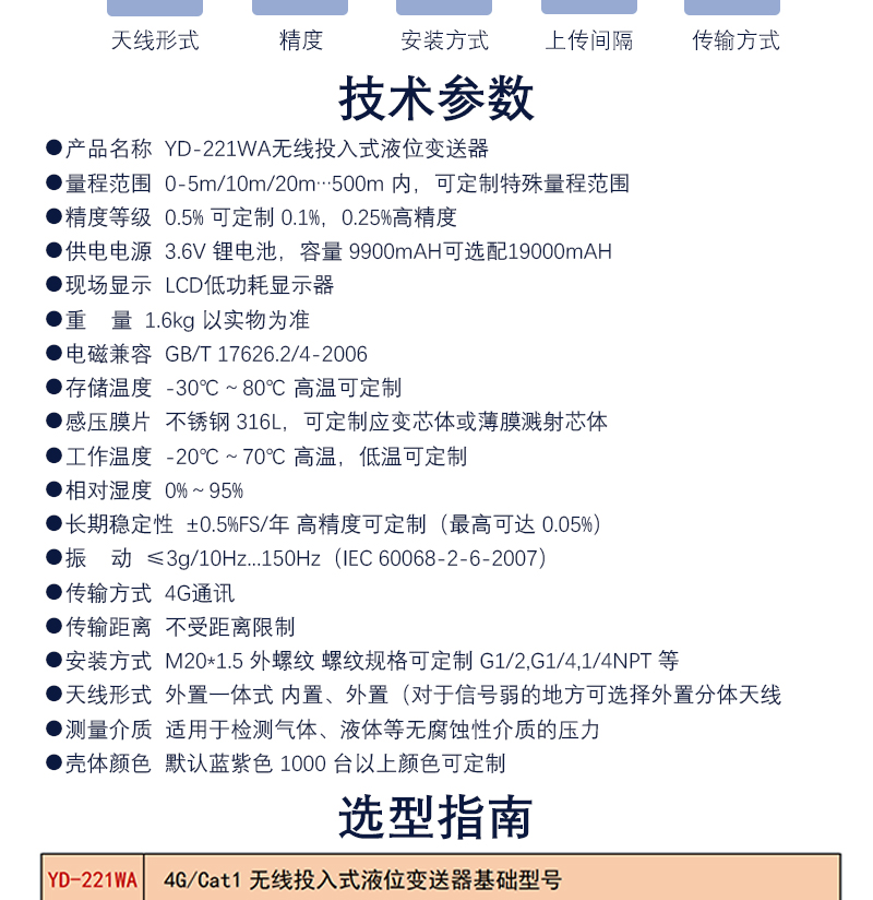 YD-221WA無線投入式液位變送器,量程范圍 0-5m/10m/20m…500m 內(nèi),可定制特殊量程范圍精度等級 0.5% 可定制 0.1%,0.25%高精度